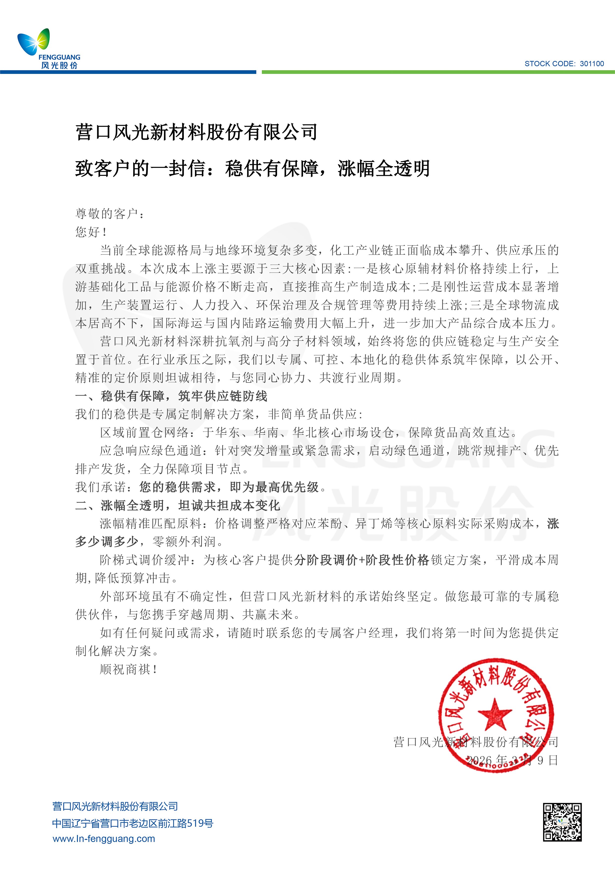 营口风光新材料深耕抗氧剂与高分子材料领域,始终将您的供应链稳定与生产安全置于首位。在行业承压之际,我们以专属、可控、本地化的稳供体系筑牢保障,以公开、精准的定价原则坦诚相待,与您同心协力、共渡行业周期。